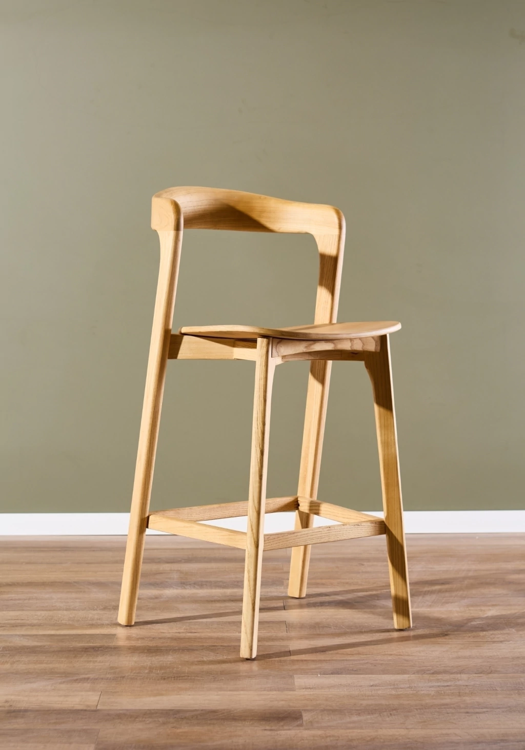 Banqueta Quimey de madera Olmo. Disponible en tres variantes de color: Madera oscura, madera clara y madera color negro.