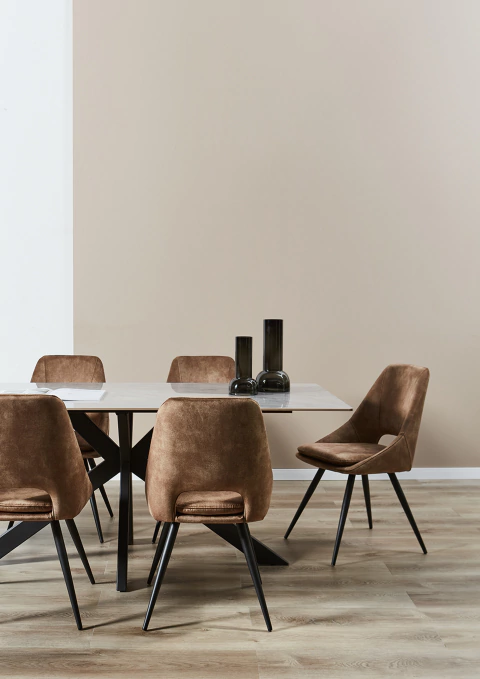 Mesa con base negra de hierro y tapa simil marmol de porcelanato blanco.